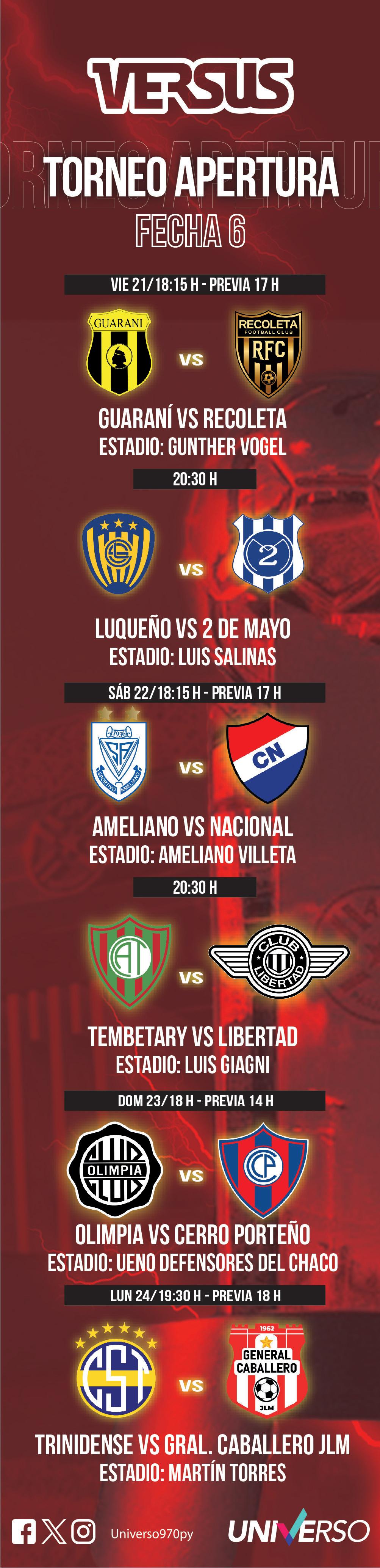 Con dos partidos se pone en marcha este viernes la sexta fecha del torneo Apertura. En el estadio Gunther Vogel del Sportivo San Lorenzo, Guaraní, único escolta de la competición oficia de local frente al Deportivo Recoleta.
