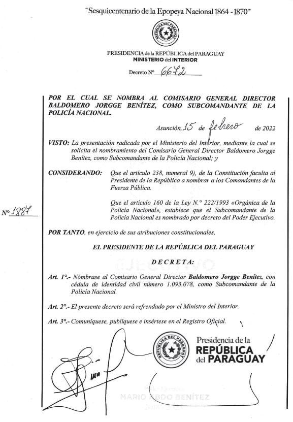 El 15 de febrero del 2022, el presidente de la República, Mario Abdo Benítez, firmó el decreto 6672 por el cual se nombra al comisario general director Baldomero Jorgge Benítez como subcomandante de la Policía Nacional