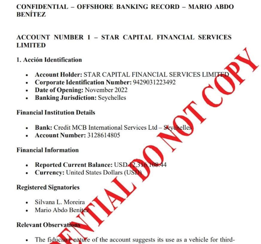 El periodista argentino Luis Gasulla, del sitio de investigación Periodismo y Punto, divulgó la existencia de dinero oculto por parte del presidente paraguayo en cuentas en el extranjero. Son dos cuentas: una a nombre de la firma Star Capital Financial Services Limited, que se halla en el banco MCB International, mientras que la segunda fue abierta en setiembre de 2023 a nombre de Exchange Contracts International Finance Limited. La primera cuenta suma USD 12.316.108,44, en tanto que la segunda presentaba un balance de USD 8 716 581,02