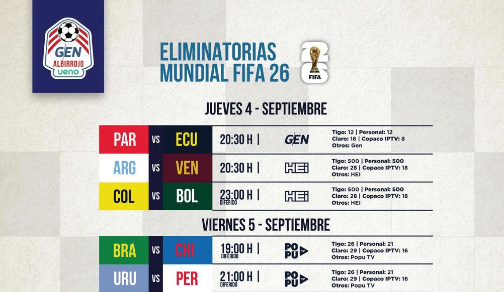 Como ya sucedió durante todas las eliminatorias, Nación Media, a través de todos sus medios, comandados por el canal GEN, llevará a todos los hogares las alternativas del partido entre Paraguay y Ecuador, que se jugará el jueves desde las 20:30.