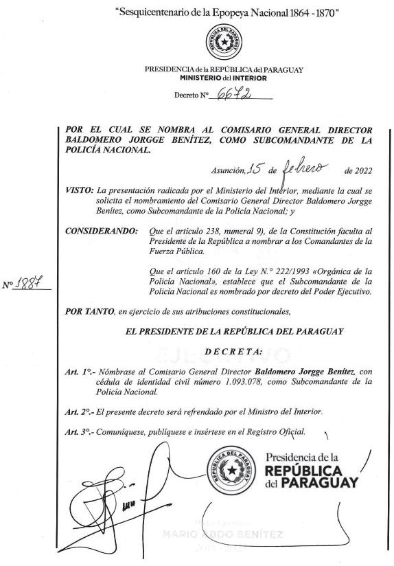 El 15 de febrero del 2022, el presidente de la República, Mario Abdo Benítez, firmó el decreto 6672 por el cual se nombra al comisario general director Baldomero Jorgge Benítez como subcomandante de la Policía Nacional