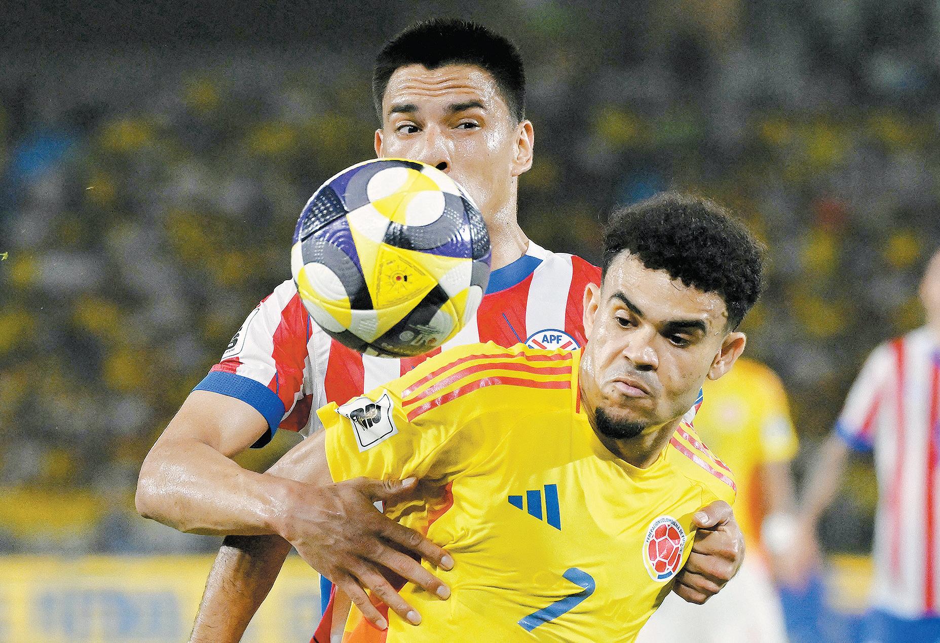 Dos talentosos sudamericanos. Diego Gómez de la Albirroja y Luis Díaz de Colombia pugnan por el balón en el juego clasificatorio al Mundial 2026