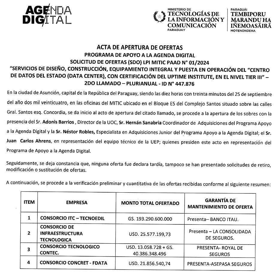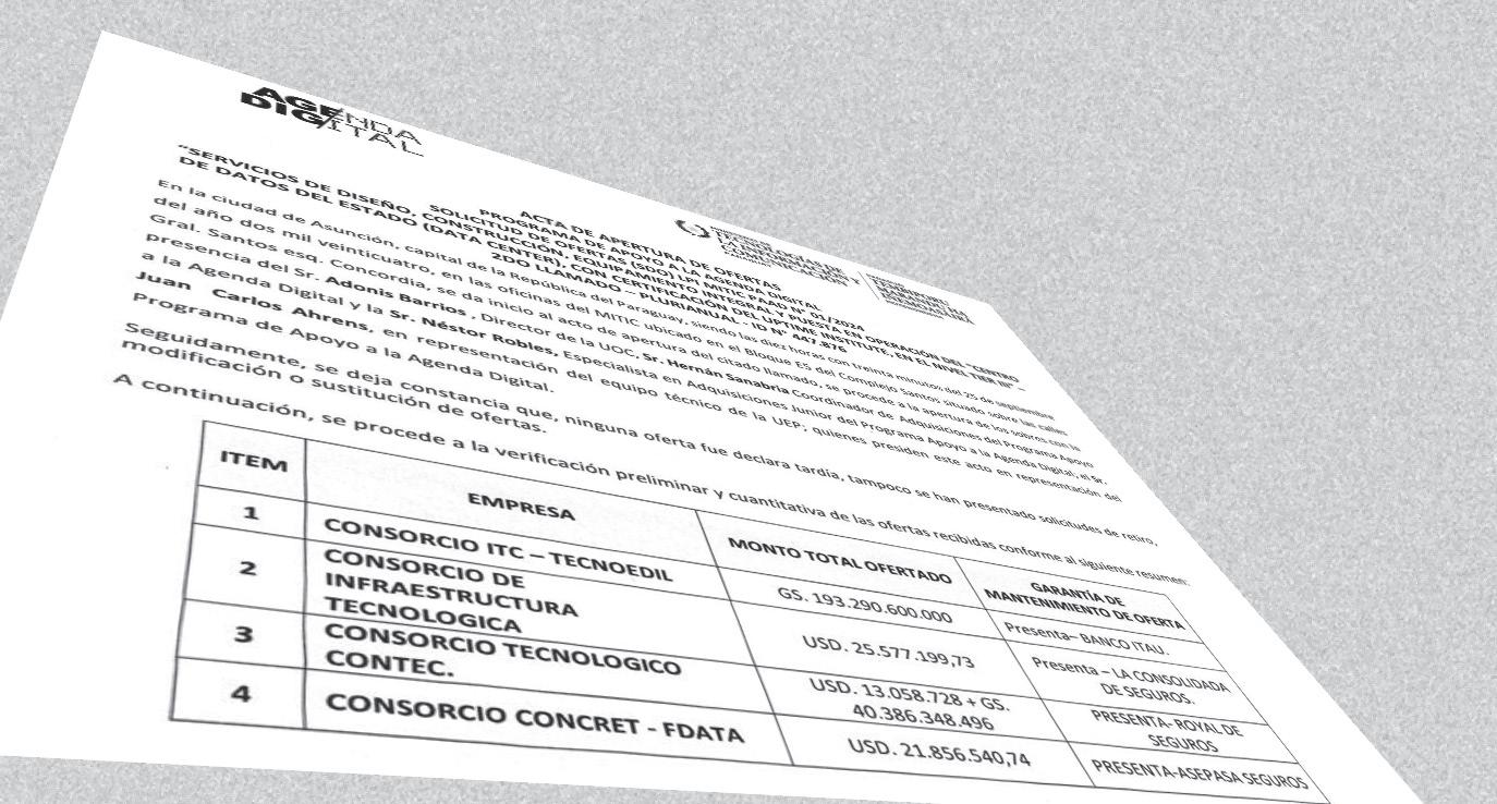 (conformado por ITC Servicios SRL y Tecnoedil SA Constructora) ofertó G. 193.290 millones; el Consorcio de Infraestructura Tecnológica (integrado por Netlogic SRL y Sociedad Constructora Chaco SA) propuso USD 25,5 millones; el Consorcio Tecnológico Contec (compuesto por Jiménez Gaona y Lima SAE, Tecnología en Electrónica e Informática SA y Geintec SA) ofreció la suma de USD 13 millones y G. 40.386 millones; y el Consorcio Concret FData (integrado por Concret Mix SA y Fibratel SL), propuso USD 21,8 millones.