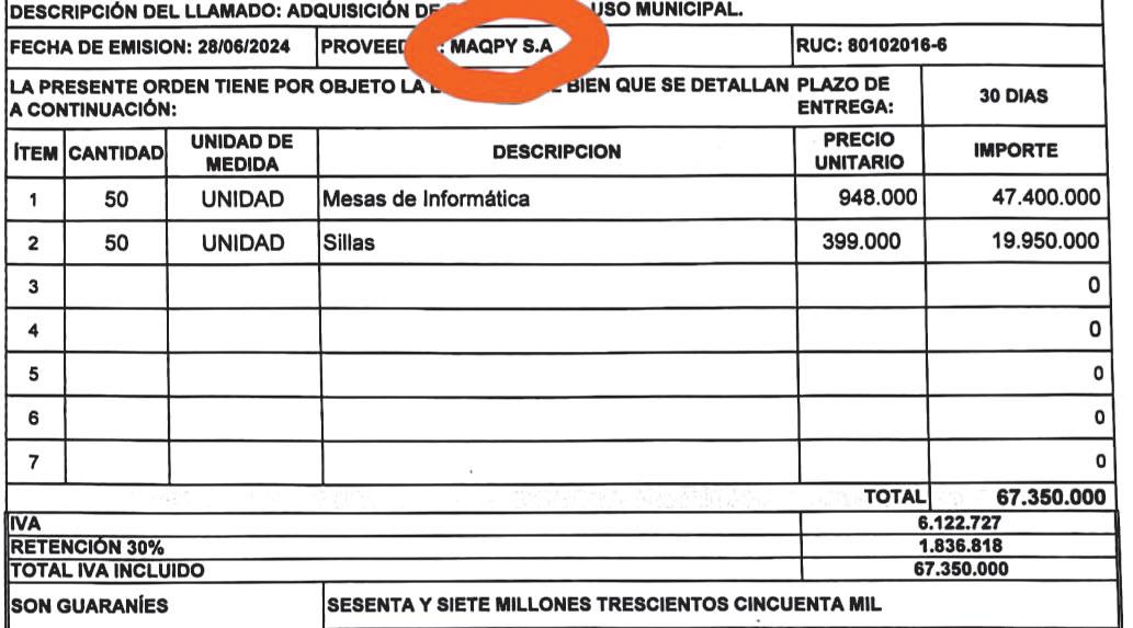 De acuerdo al contrato suscrito entre Naranjal, encabezada por Edoard Schaffrath del 2024, y la empresa MAQPY SA, quien proveyó 50 mesas a G. 948.000 y 50 sillas a G. 399.000, lo cual totaliza G. 1.347.000 cada set. Si se