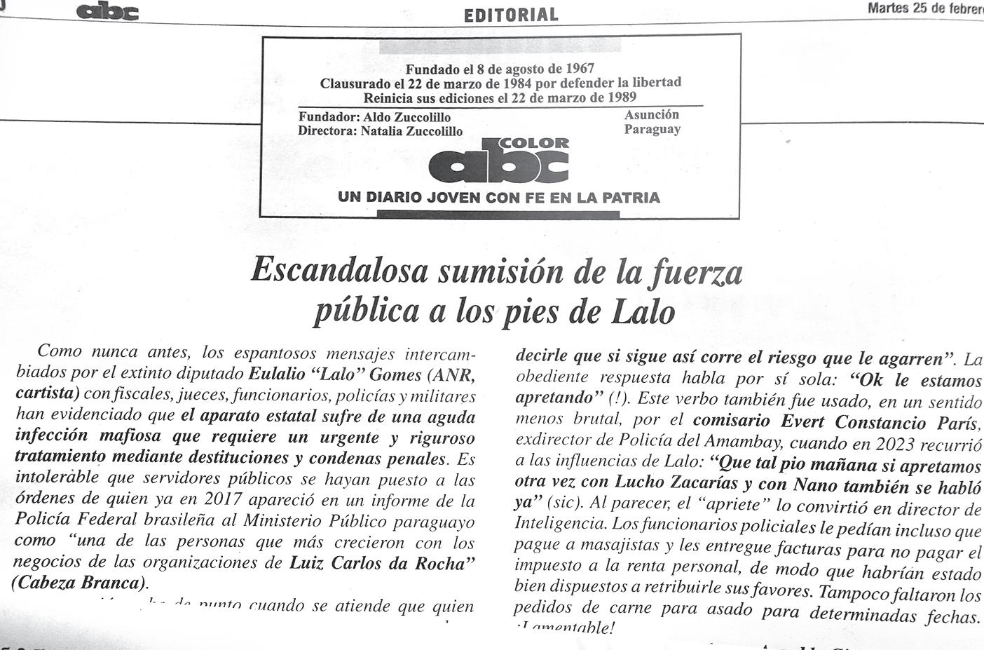 En su editorial de ayer, Abc se escandaliza por “sumisión de la fuerza pública” a Lalo, pero en ninguna parte menciona que estas acciones se dieron durante el gobierno de Abdo