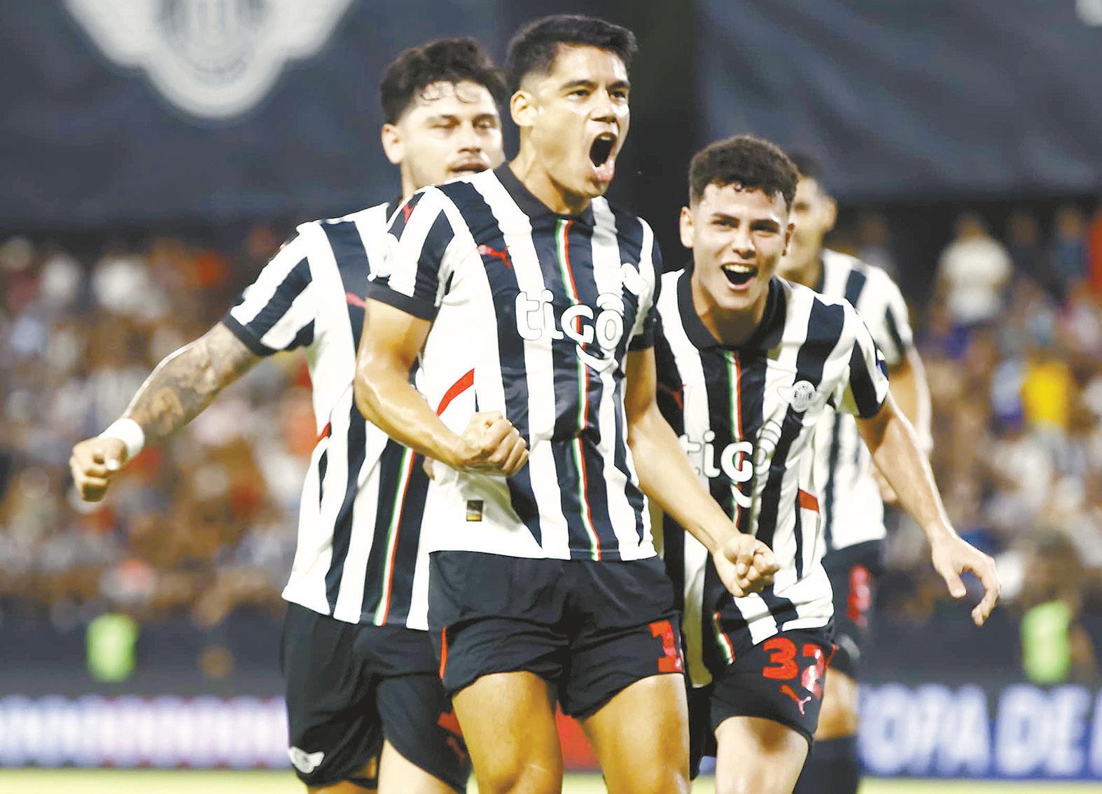 Lorenzo Melgarejo grita su gol, se asocian a la alegría Matías Espinoza y Rodrigo Villalba