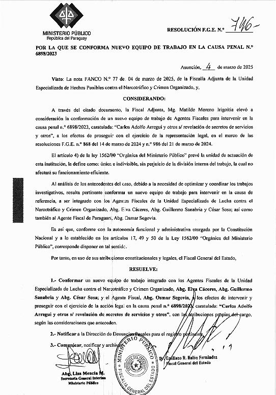 Los fiscales César Alberto Sosa y Elva Cáceres Samudio, de la Unidad Especializada contra el Narcotráfico y Crimen Organizado, fueron designados a través de una nota firmada el 4 de marzo pasado. Los mismos remitieron una nota al Juzgado Penal de Garantías, a fin de hacer un pedido sobre la causa caratu-