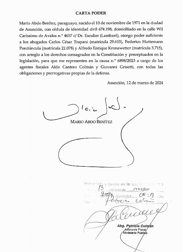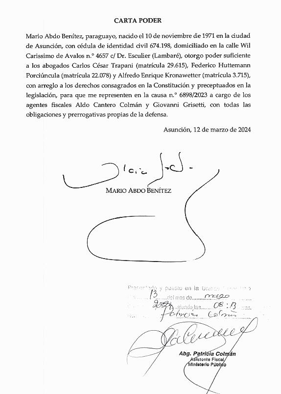 En ese sentido, señaló que los abogados Carlos César Tra pani, Federico Huttemann y Alfredo Enrique Kronawetter, que de acuerdo a la carta poder firmada por Abdo Bení tez el 12 de marzo de 2024, fueron designados para que lo representen en el proceso penal del caso Seprelad. Todos ellos pertenecen al buffet de abogados Beker Meyer, sobre todo Huttemann y Kronawe tter que están a cargo de los procesos penales, según se puede leer la información pública que contiene la página web www.berke.com.py.