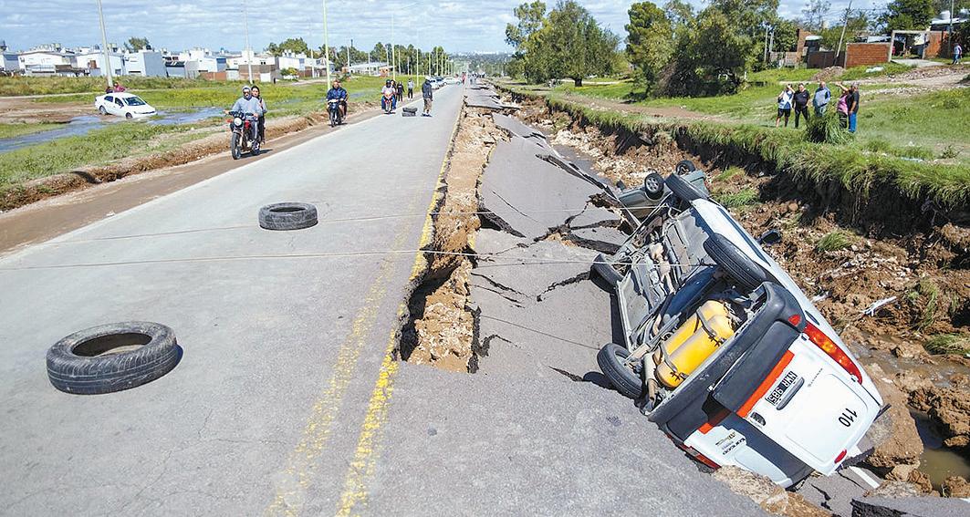 Vehículos volcados en una carretera tras una fuerte tormenta que azotó a la ciudad portuaria argentina
