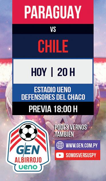 La Albirroja disputa un duelo crucial hoy ante el seleccionado de Chile. Una victoria nos ubicaría en las puertas de la clasificación al Mundial Norteamérica 2026. “Nos jugamos por el país”, declaró el DT Gustavo Alfaro en la conferencia de prensa. Gustavo Gómez, por lesión, y Diego Gómez, por roja, no serán parte de la alineación. El partido es a las 20:00 en el estadio Defensores del Chaco y se podrá ver por la señal de GEN. P. 27-28