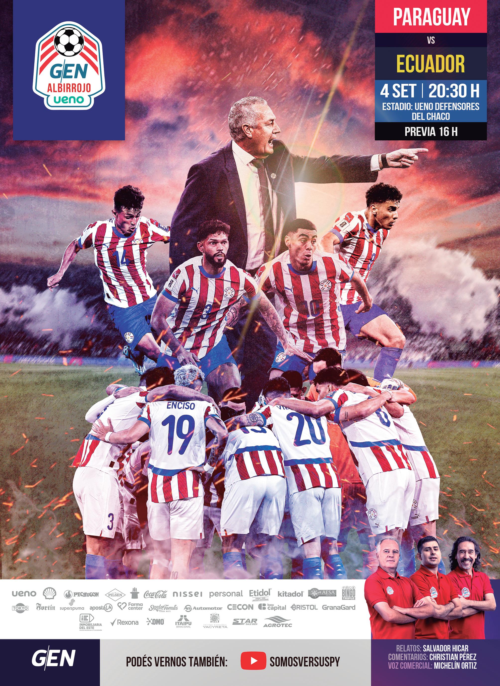 La fecha 17 de las eliminatorias sudamericanas se juega íntegramente hoy. Por tal motivo, el Grupo Nación Media realizará una megacobertura con el GEN Albirrojo ueno, a través de las pantallas de GEN, Universo y HEi. Con los derechos exclusivos, Nación Media sigue a la selección albirroja en la ruta al Mundial 2026 de México, Estados Unidos y Canadá. Paraguay afronta un desafío crucial de local contra Ecuador y la transmisión central será en vivo por GEN, los canales de YouTube de GEN y Versus.