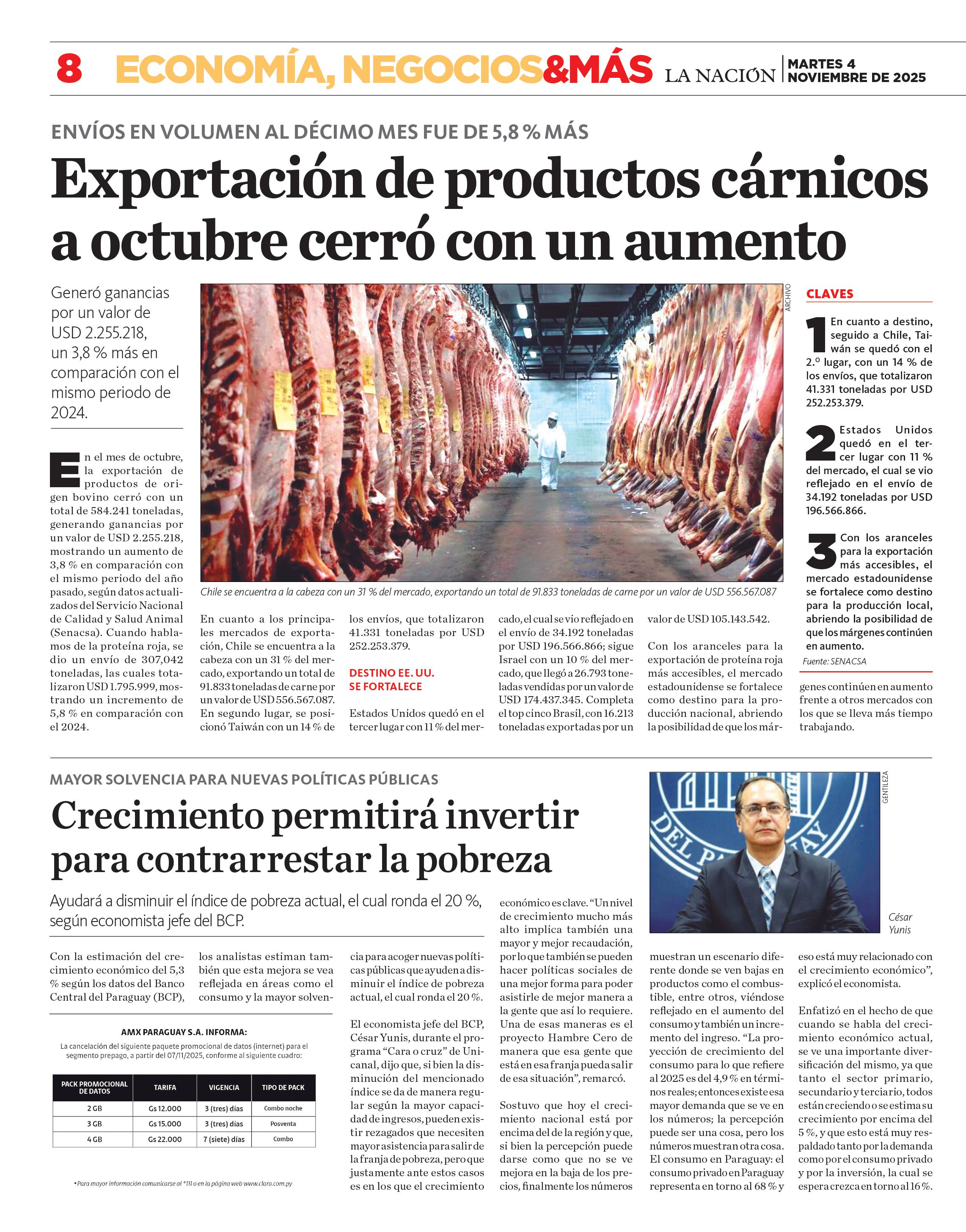 La exportación de productos de origen bovino cerró con un total de 584.241 toneladas, generando ganancias por un valor de USD 2.255.218, mostrando un aumento de 3,8 %, según Senacsa. P. 8