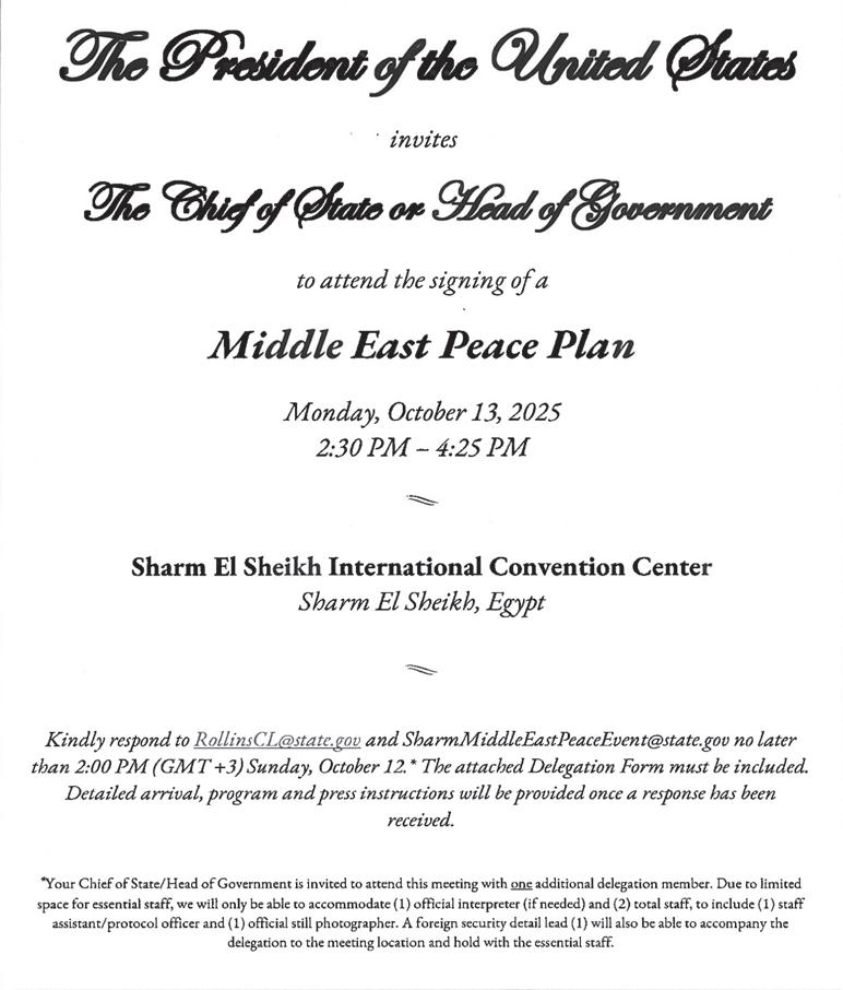 blica de Paraguay Santiago Peña, para asistir a la Cumbre para la Firma de un Plan de Paz para el Medio Oriente que tomará lugar en Sharm el-Sheikh, Egipto el 13 de octubre de 2025”, reza la nota remitida por la embajada.