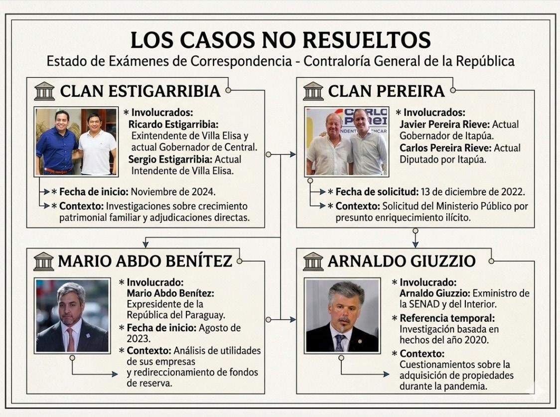 En noviembre de 2024, la Contraloría también inició un estudio de correspondencia de bienes a los hermanos Estigarribia. “Está en etapa de conclusión” es la reiterada respuesta que nuestro medio recibe cada vez que consulta a la Contraloría por la investigación.