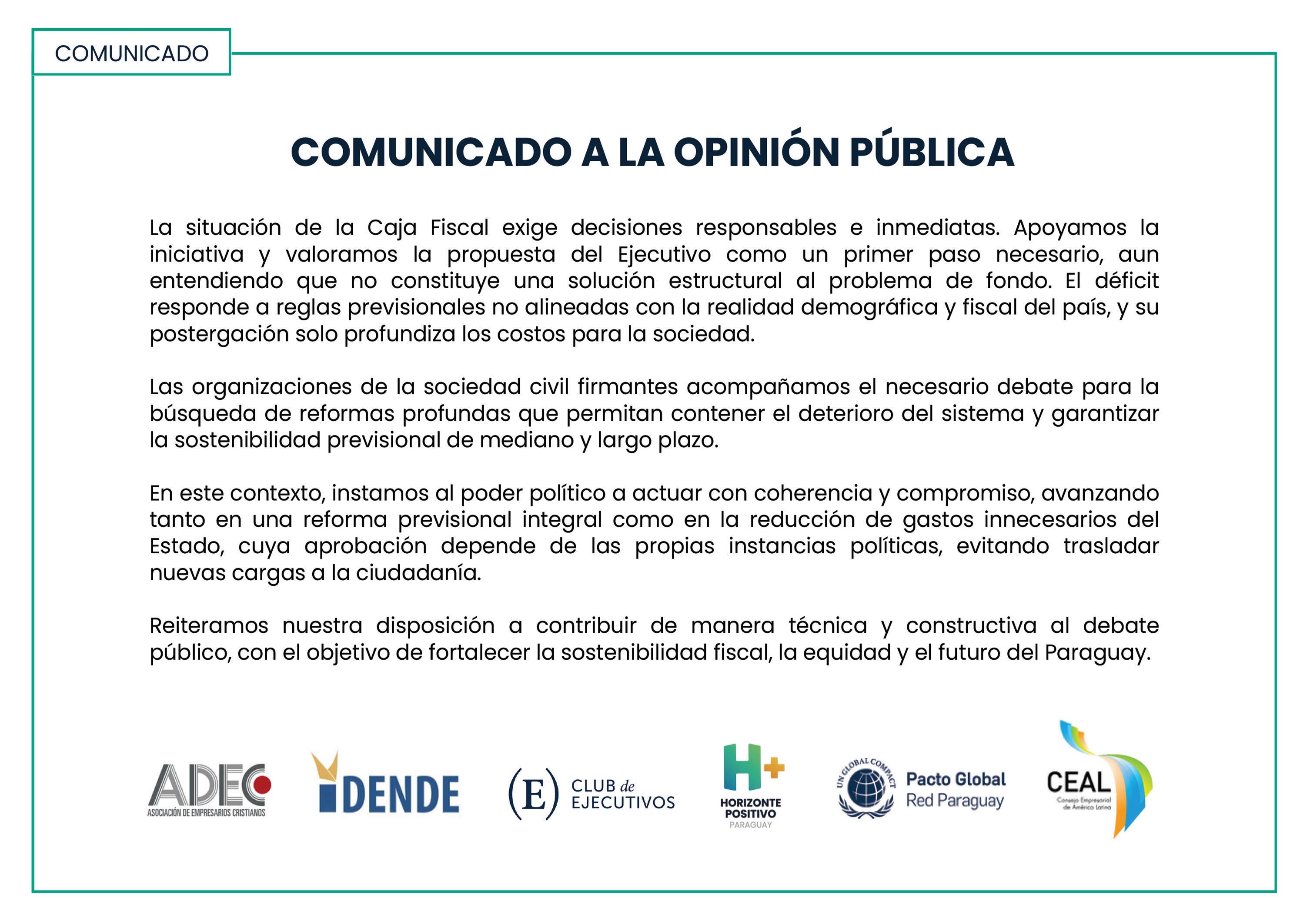 “Los gremios aquí representados respaldamos de manera firme y sin reservas la apertura del debate sobre la reforma de la Caja Fiscal y adherimos plenamente a las posiciones ya expresadas”, señala el manifiesto.