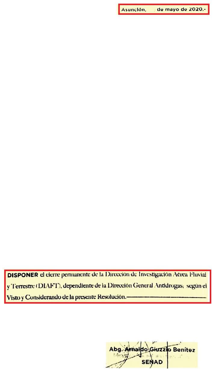 Resolución 142 de mayo de 2020, cuando Giuzzio era ministro de la Senad. Con esta medida dejó desguarnecido a los puertos privados, por donde circuló la droga rumbo a Europa