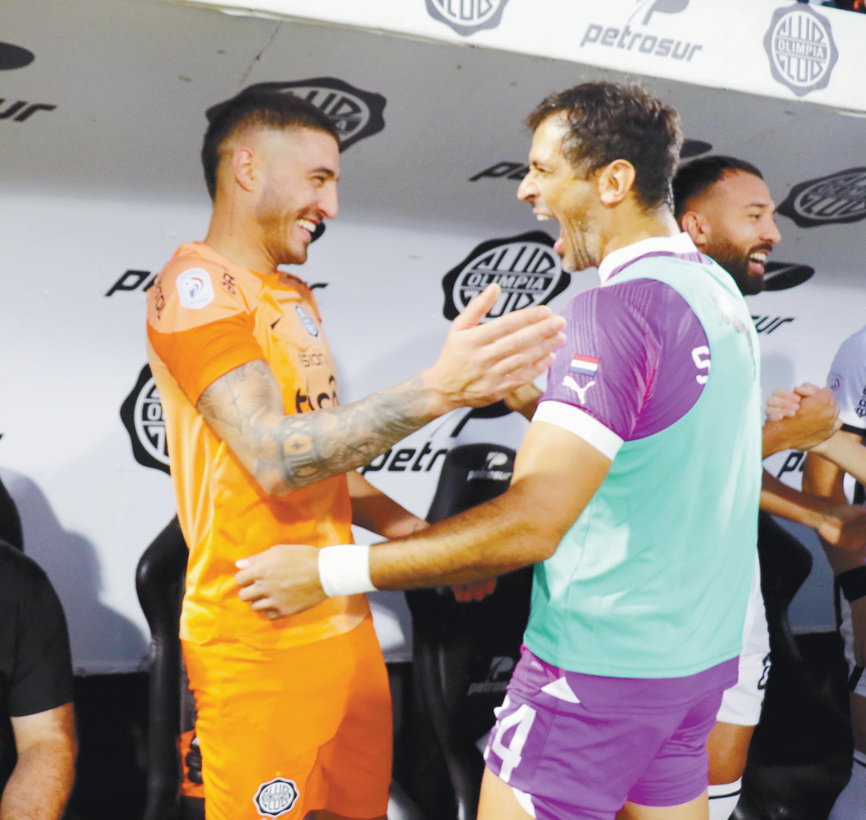 El arquero de Olimpia Gastón Olveira y el ofensivo de Libertad Roque Santa Cruz, en la previa de un duelo anterior