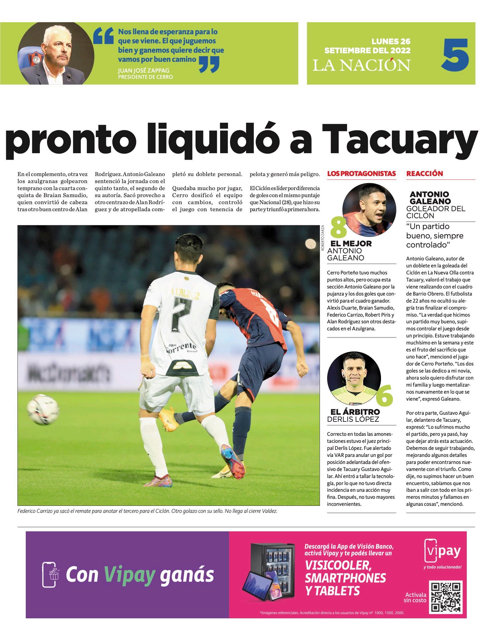 REPÚBLICA DEL PARAGUAY - AÑO 28 - Nº 9.934 - G. 6.000 Antonio Galeano, en el festejo del primero de los dos goles que convirtió. ROBERTO ZARZA El Azulgrana fue muy contundente y liquidó el expediente en el primer tiempo para seguir en lo alto de la tabla. Superciclón 4-5 ] CERRO PORTEÑO APLASTÓ 5-0 A TACUARY LUNES SETIEMBRE DEL 2022 26 RESULTADOS FECHA 13 Resistencia 0-1 Nacional Cerro 5-0 Tacuary Ameliano 2-0 Guaireña Gral. Caballero 3-0 Guaraní 12 de Octubre 0-2 Sol POSTERGADO Olimpia VS Libertad