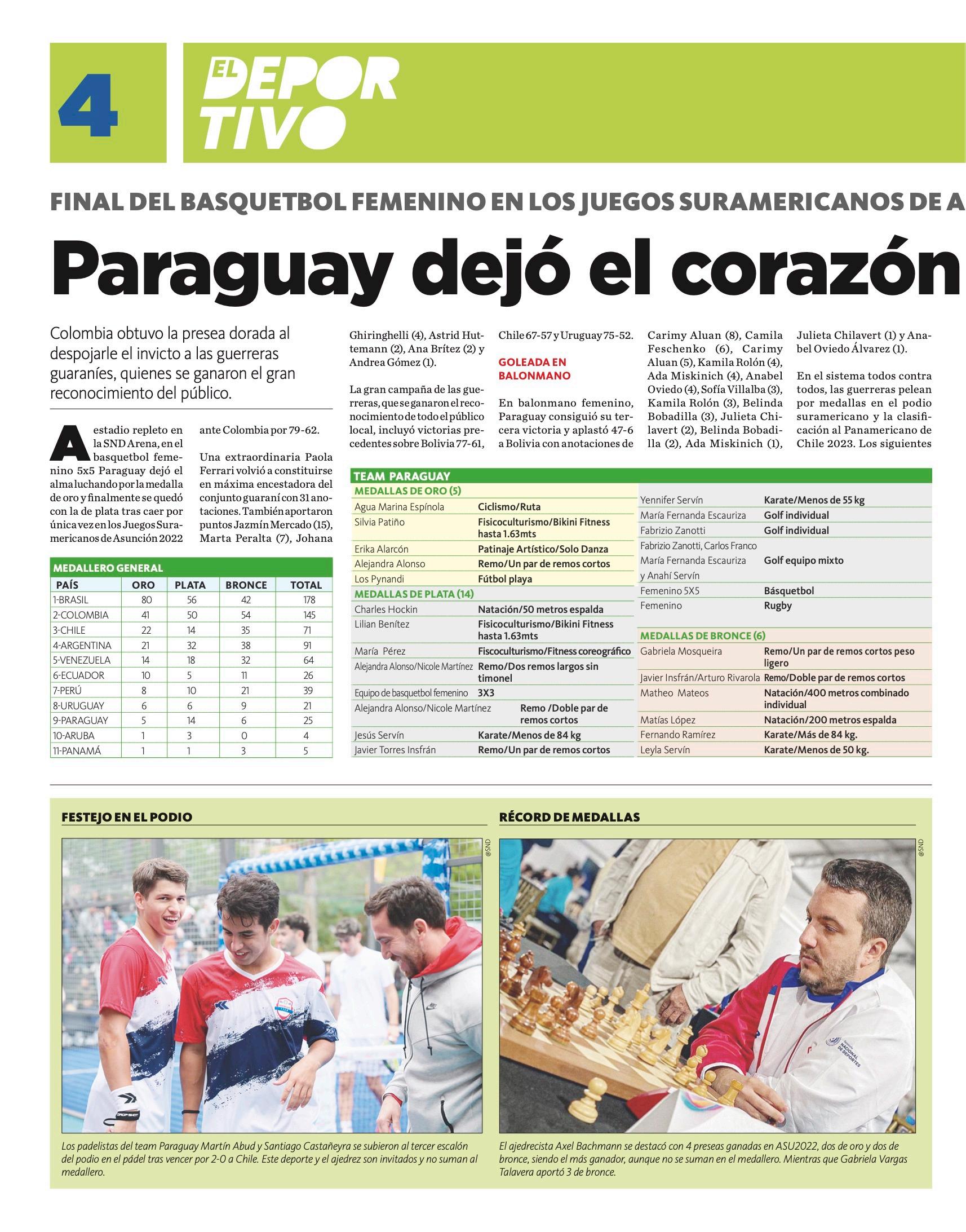 Buscando aumen tar su medallero en estos históricos XII Juegos Suramericanos Asun ción 2022, el team Paraguay afronta hoy una nueva jor nada en la que sus apuestas fuertes son el hándbol feme nino y el fútbol masculino, mientras que el tenis hace su aparición en canchas del Rakiura Resort, de Luque. Con una derrota en su estreno ante Brasil y tres triunfos seguidos sobre Argentina, Uruguay y Bolivia, el hán dbol femenino define esta tarde una de las medallas en su duelo contra Chile, desde las 16:00. Mientras que en fút bol masculino, la Albirroja irá por un lugar en la final del tor neo, a partir de las 9:00, ante la selección de Colombia.