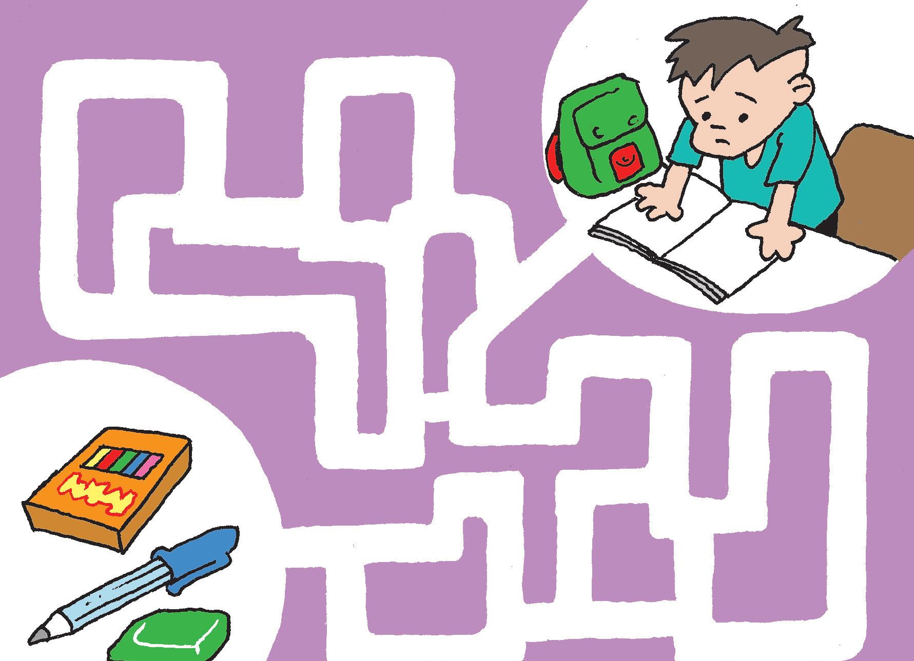 Llegó la hora de hacer la tarea y Pablito se dio cuenta que en algún lado olvidó sus lápices. Ayúdalo a encontrarlos indicándole el camino correcto para llegar hasta ellos.