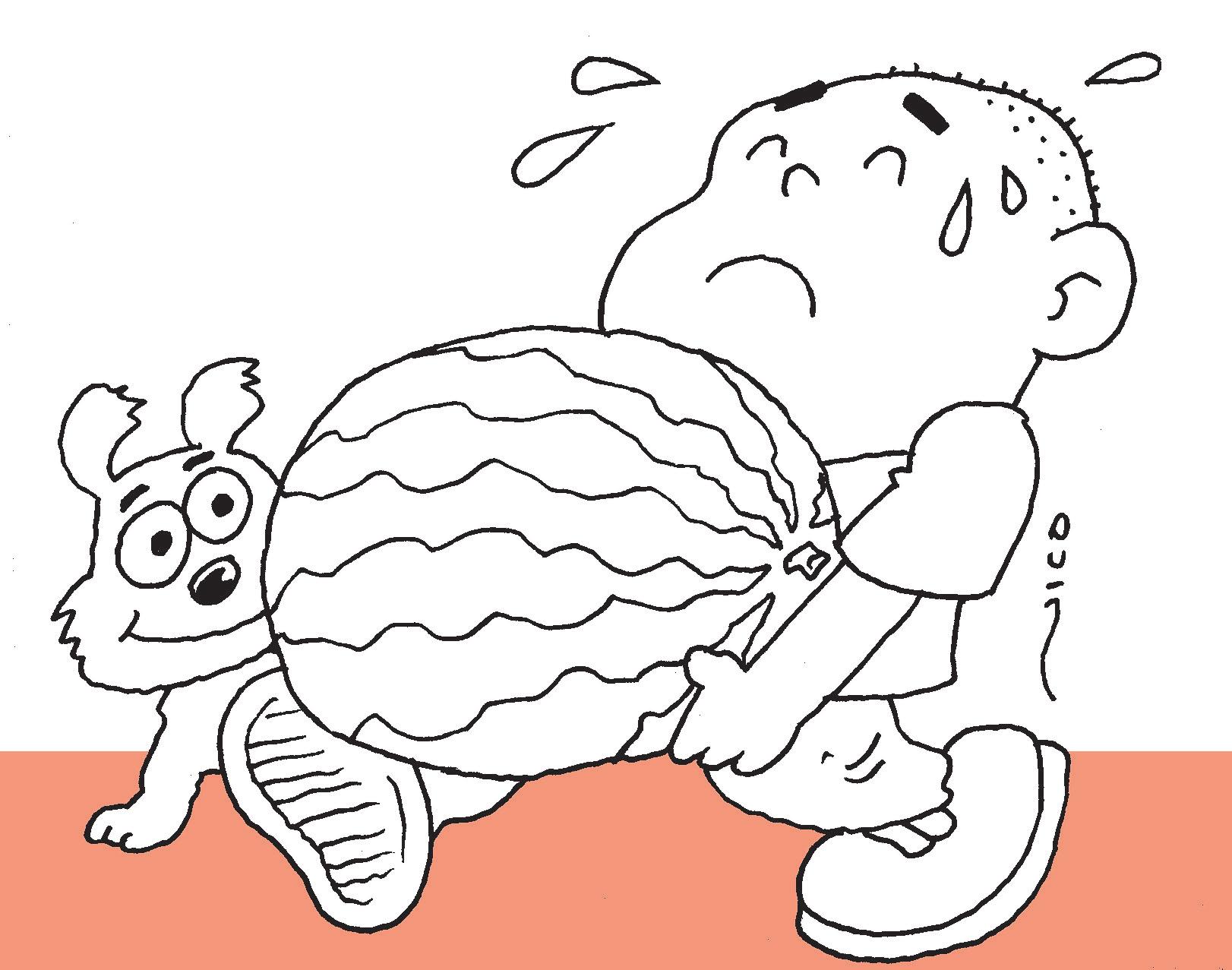 Octavio se fue a comprar una sandía en la despensa de la esquina...pero justo eligió la más grande y pesada. ¿Será que llegará a destino? Pinta la escena con los colores que quieras.