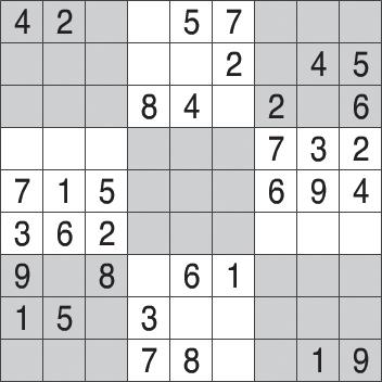Los rompecabezas de sudoku consisten en cinco cuadrículas de sudoku superpuestas. Las reglas estándar de sudoku se aplican a cada cuadrícula de 9 x 9. Coloque dígitos del 1 al 9 en cada celda vacía. Cada fila, cada columna y cada cuadro de 3 x 3 debe contener uno de cada dígito.