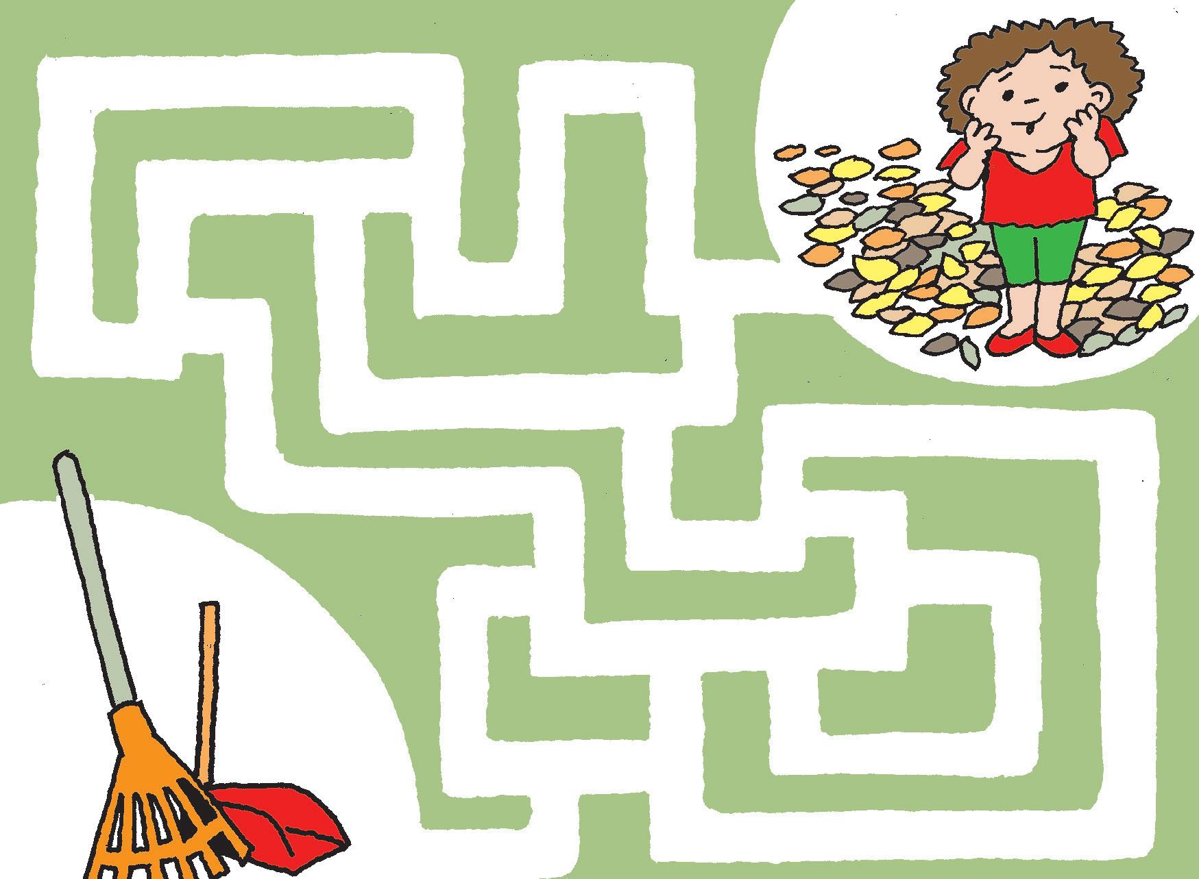 El viento echó al suelo un montón de hojas secas. ¿Con qué se las puede juntar? Busca el camino más corto para llegar hasta los elementos necesarios.