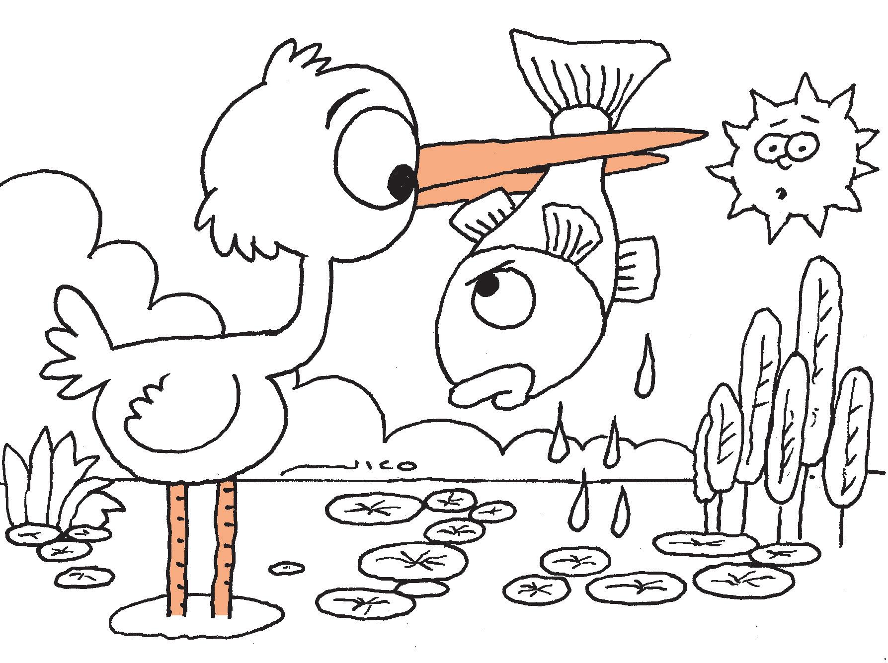 A la garza, que anda por las lagunas, le encanta comer pescado. Y justo pescó uno enorme. Pinta la escena con los colores que más te gusten.