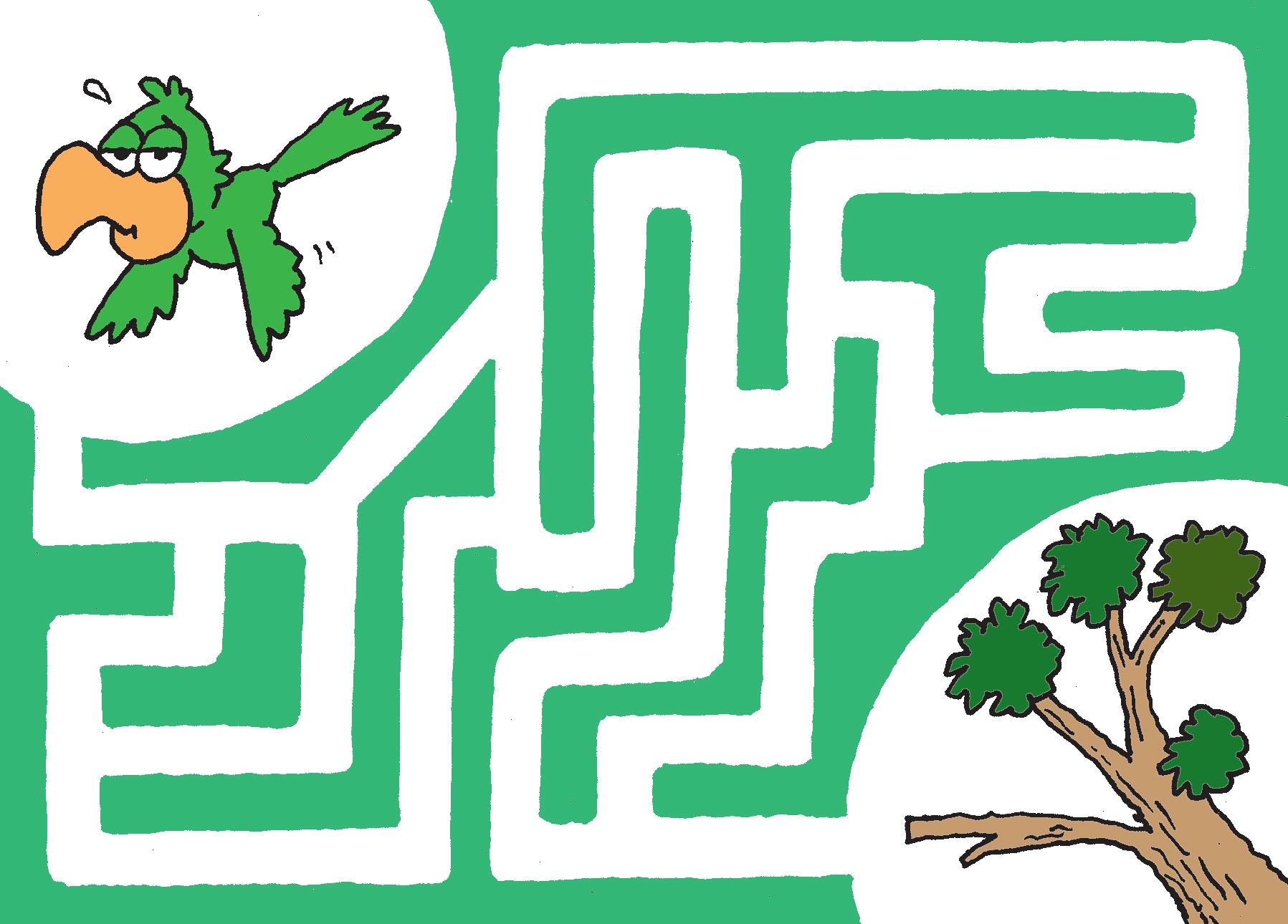 El lorito que ves aquí, está volando desde muy temprano y ya se siente cansado. Busca un camino corto para que llegue hasta la rama y así poder descansar.