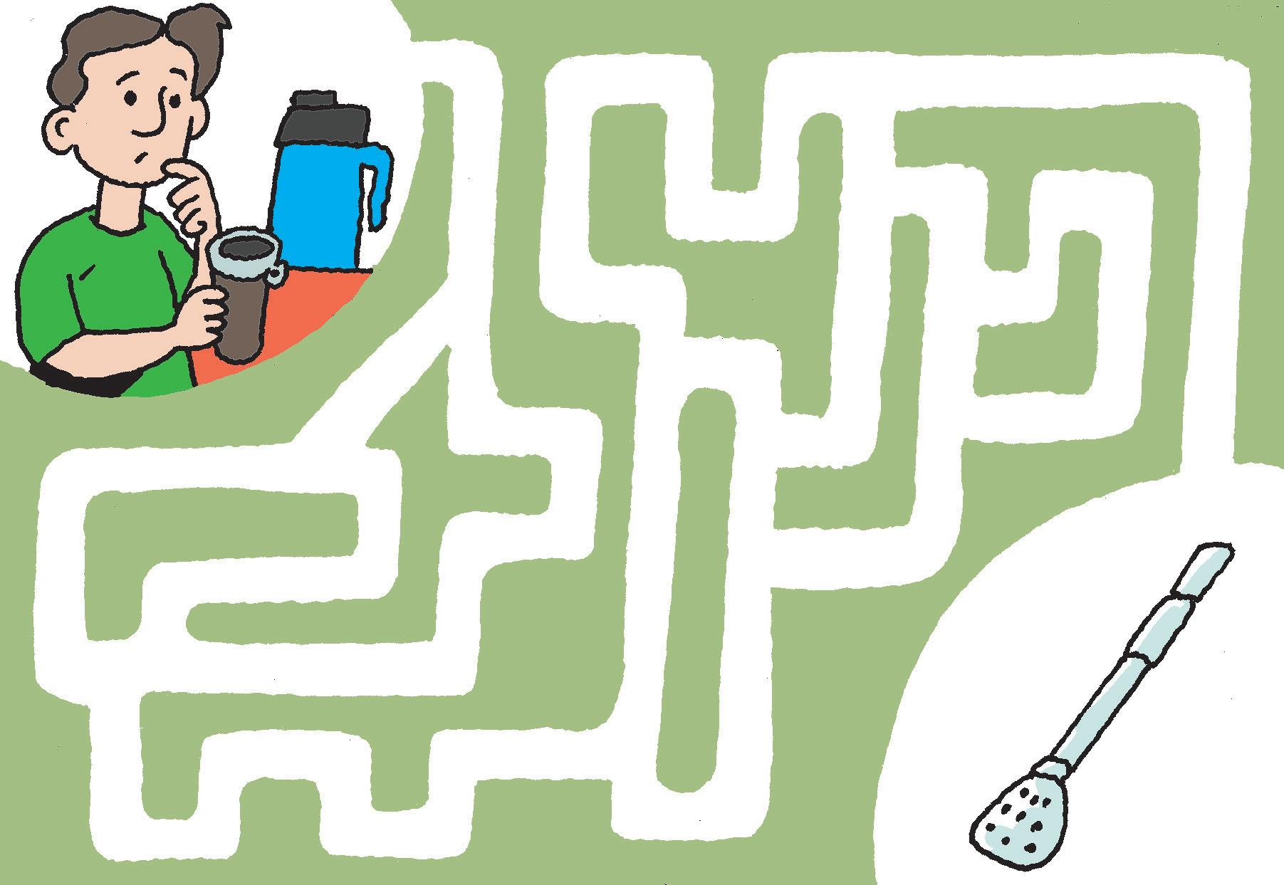 Mi papá quiere tomar tereré. Ya tiene todo, el termo con agua y hielo, la guampa, la yerba...¿ qué le falta? ¡Muy bieeennn! le falta la bombilla. Busca el camino más corto para llegar hasta ella.