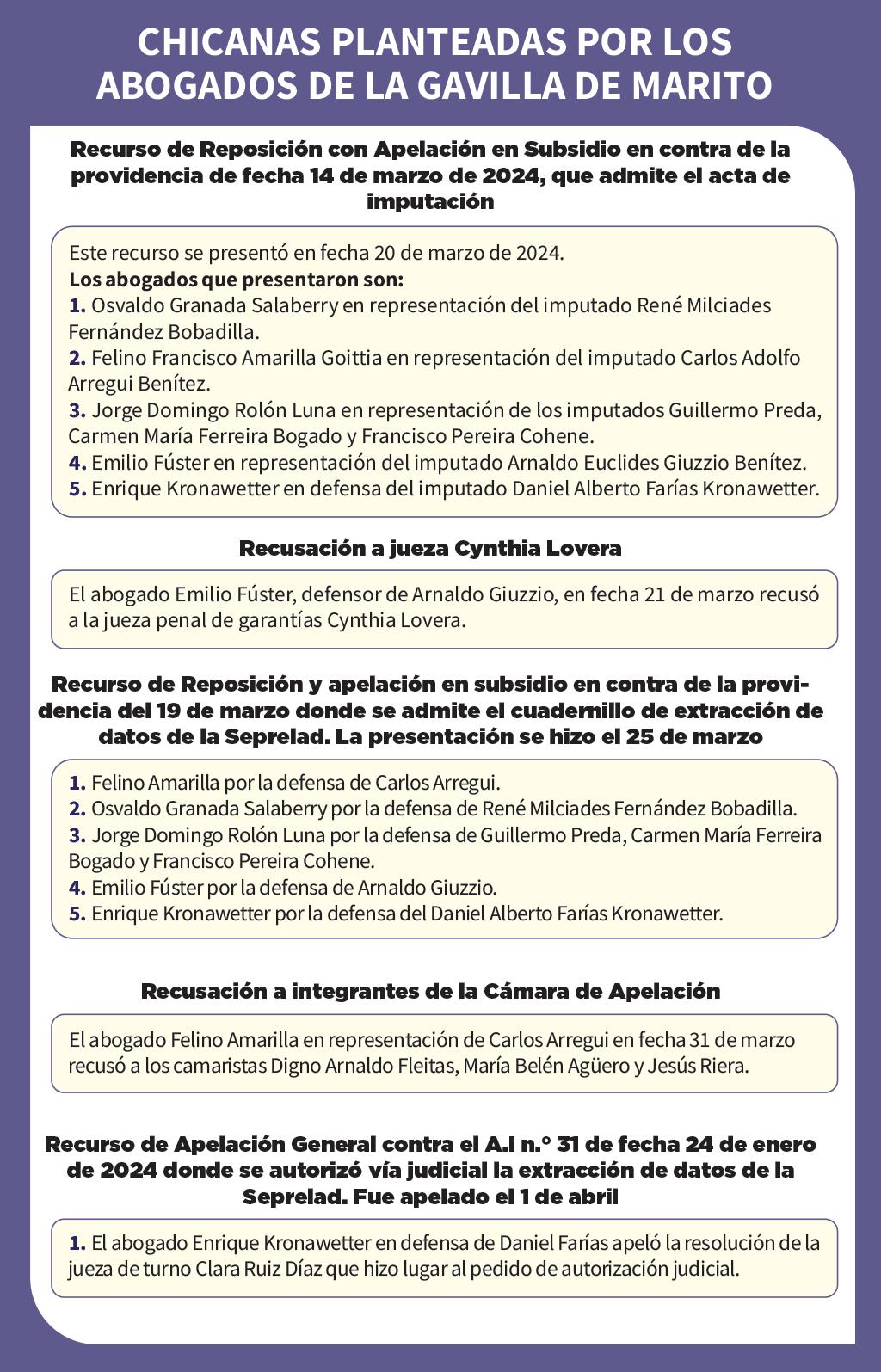 la Sala Penal de la Corte y titular de la máxima instancia judicial Luis María Benítez Riera. Argumenta que Benítez Riera supuestamente mantiene vínculos con el empresario José Ortiz, socio comercial y exasesor ad honorem del expresidente Horacio Cartes, sujeto de las filtraciones.