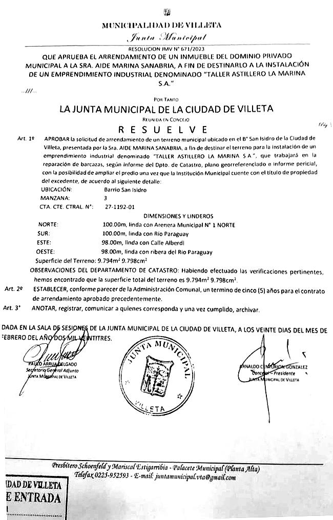 Para comprender este caso, La Nación/Nación Media se comunicó con la concejal colorada Laura Acosta, quien explicó que en febrero de 2023, la empresa Astillero La Marina había arrendado inicialmente 9.794 m2 de terreno municipal conforme resolución, para el astillero que hasta la fecha no existe.