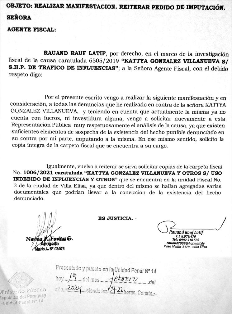 A4 años de haber denunciado a Kattya González por tráfico de influencias en sus tiempos de diputada nacional, el ingeniero alemán Rauand Rauf Latif reiteró hace unos meses al Ministerio Público el pedido de imputación.