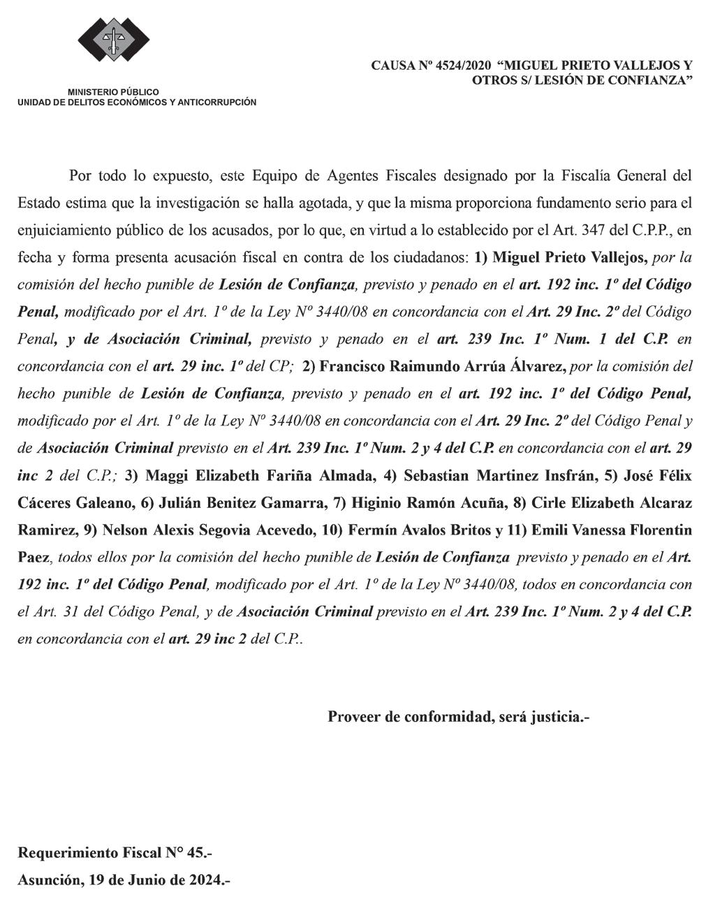 Junto al jefe comunal fueron acusados Francisco Raimundo Arrúa Álvarez, Maggi Elizabeth Fariña Almada, Sebastián Martínez Insfrán, José Félix Cáceres Galeano, Julián Benítez Gamarra, Higinio Ramón Acuña, Cirle Elizabeth Alcaraz Ramírez, Nelson Alexis Segovia Acevedo, Fermín Ávalos Britos y Emili Vanessa Florentín Páez, todos ellos por la comisión del hecho punible de lesión de confianza previsto y asociación criminal.