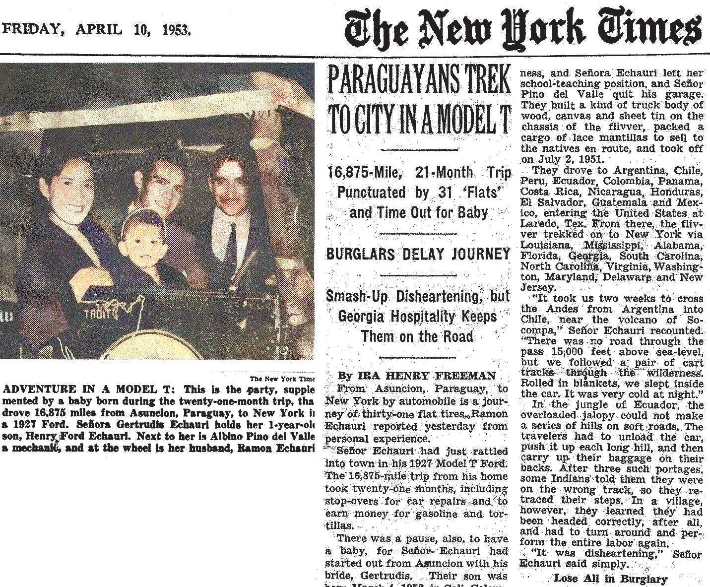 El extraordinario raid del Fordmidable: de Asunción a Nueva York en un Ford T A mediados del siglo pasado, un grupo de paraguayos condujo más de 27.000 kilómetros para cruzar el continente en un vehículo muy especial. La mujer del equipo iba embarazada y tuvo a su hijo en el camino. Hoy ese niño, que tiene 72 años, cuenta en entrevista con La Nación/Nación Media las peripecias y aventuras de aquel legendario viaje que se narra en un libro y espera por su anhelada película. P. 22 A 24