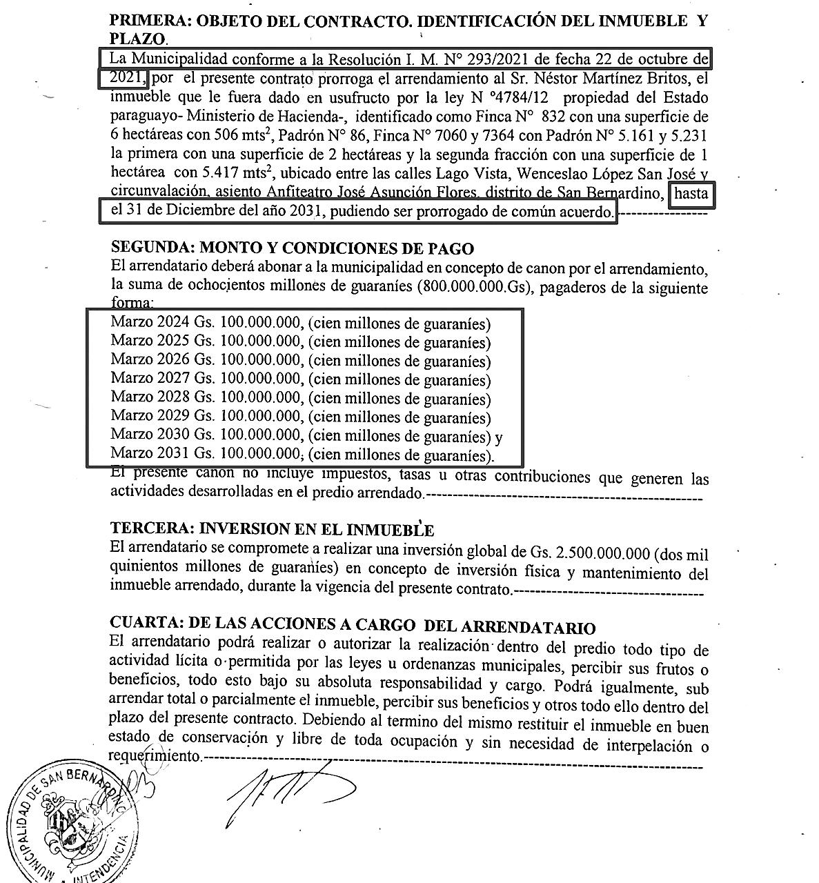 2024 al 2031 por una suma de G. 100 millones al año, unos G. 8.333.333 mensuales, a pesar de no haber fenecido el actual documento contractual.