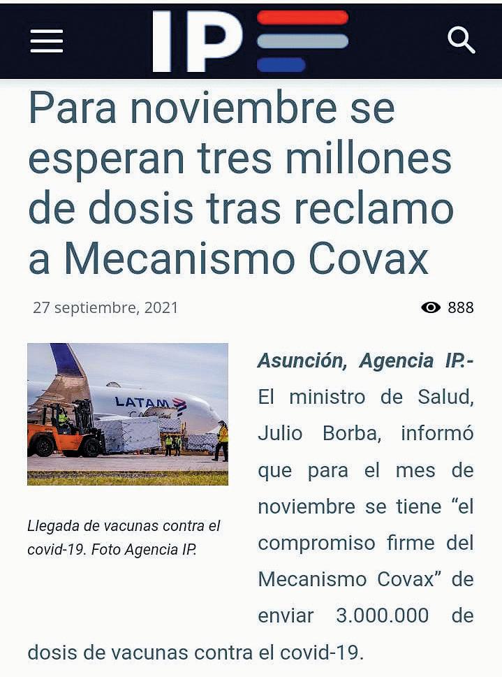 Pero el caso de Covax conti nuó igual, solamente prome sas y más promesas. El 27 de setiembre del 2021, el minis tro de Salud, Julio Borba, había anunciado que había un “firme compromiso” de recibir 3 millones en noviem bre, pero de eso nada pasó.