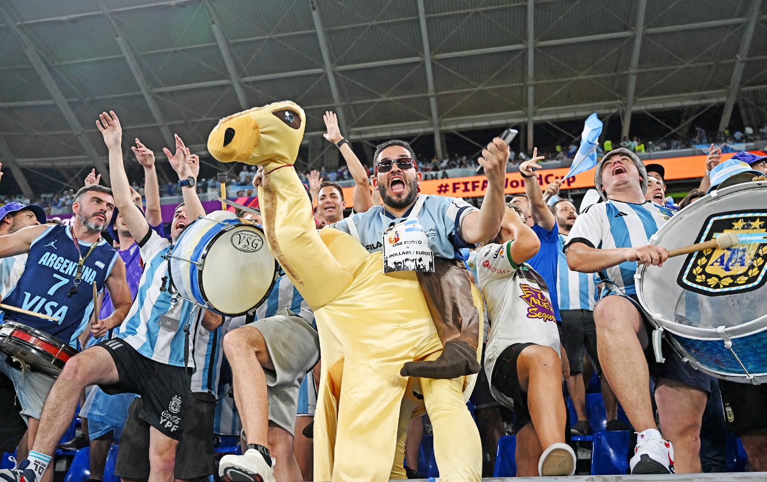 Aficionado argentino montado en camello junto a una multitud disfrutando de la fiesta del fútbol.