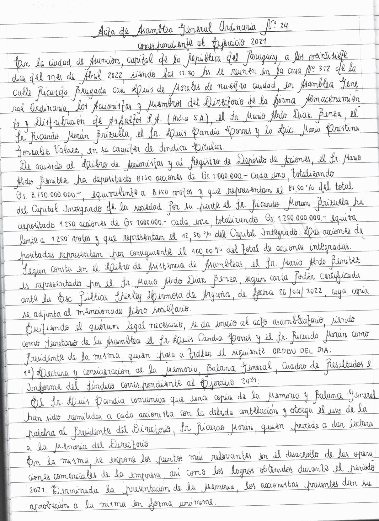 El acta de asamblea de Aldia que demuestra que el mandatario otorgó poder de representación a su hijo Mario Abdo Díaz Benza en distribuidora que vende asfalto a contratistas del Estado.