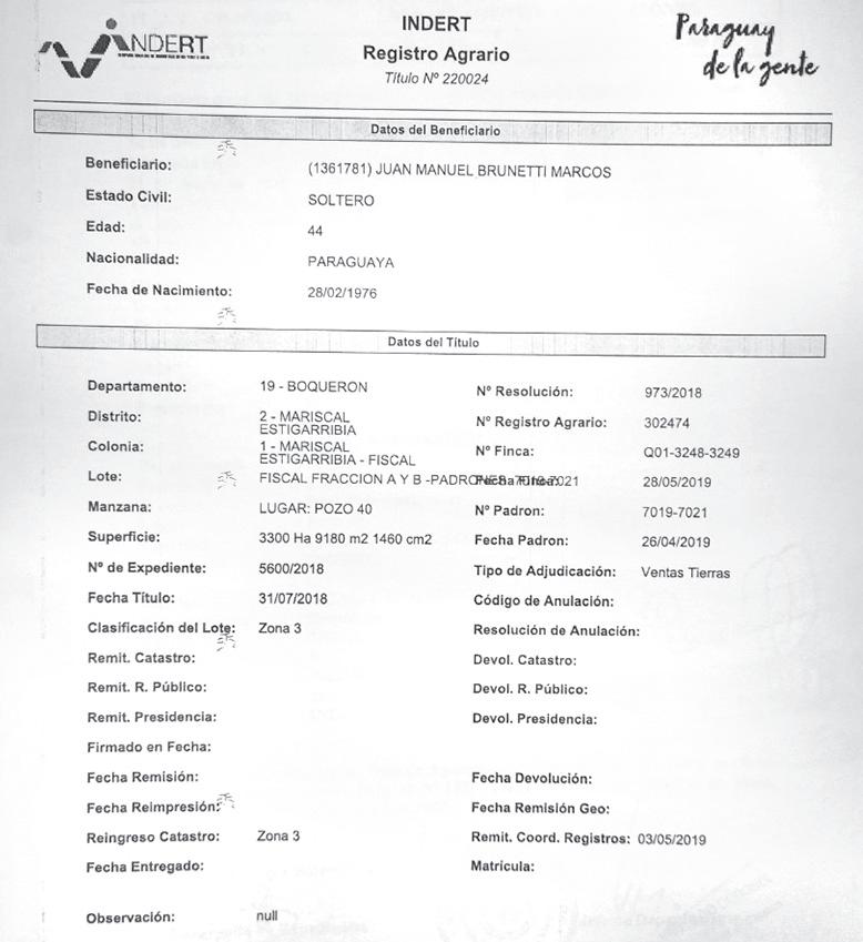Unidad de Investigación Nación MediaJuna Manuel Brunetti, actual precandidato a la Vicepresidencia de la República por el oficialismo de la Asociación Nacional Republicana – Partido Colorado, se benefició en tiempo récord con 3.300 hectáreas de tierras del Instituto Nacional de Desarrollo Rural y de la Tierra (Indert) entre marzo y julio del 2018, y que están ubicadas en la zona de la colonia Pozo 40, en el distrito de Mariscal Estigarribia, departamento de Boquerón. Esta velocidad y eficiencia de gestión estuvo ausente en la implementación de mejoras al sistema educativo cuando estuvo como ministro de Educación, de marzo del 2021 a marzo del 2022, pues solamente ejecutó el 28% de los rubros de construcciones, mantenimientos y reparaciones edilicias.