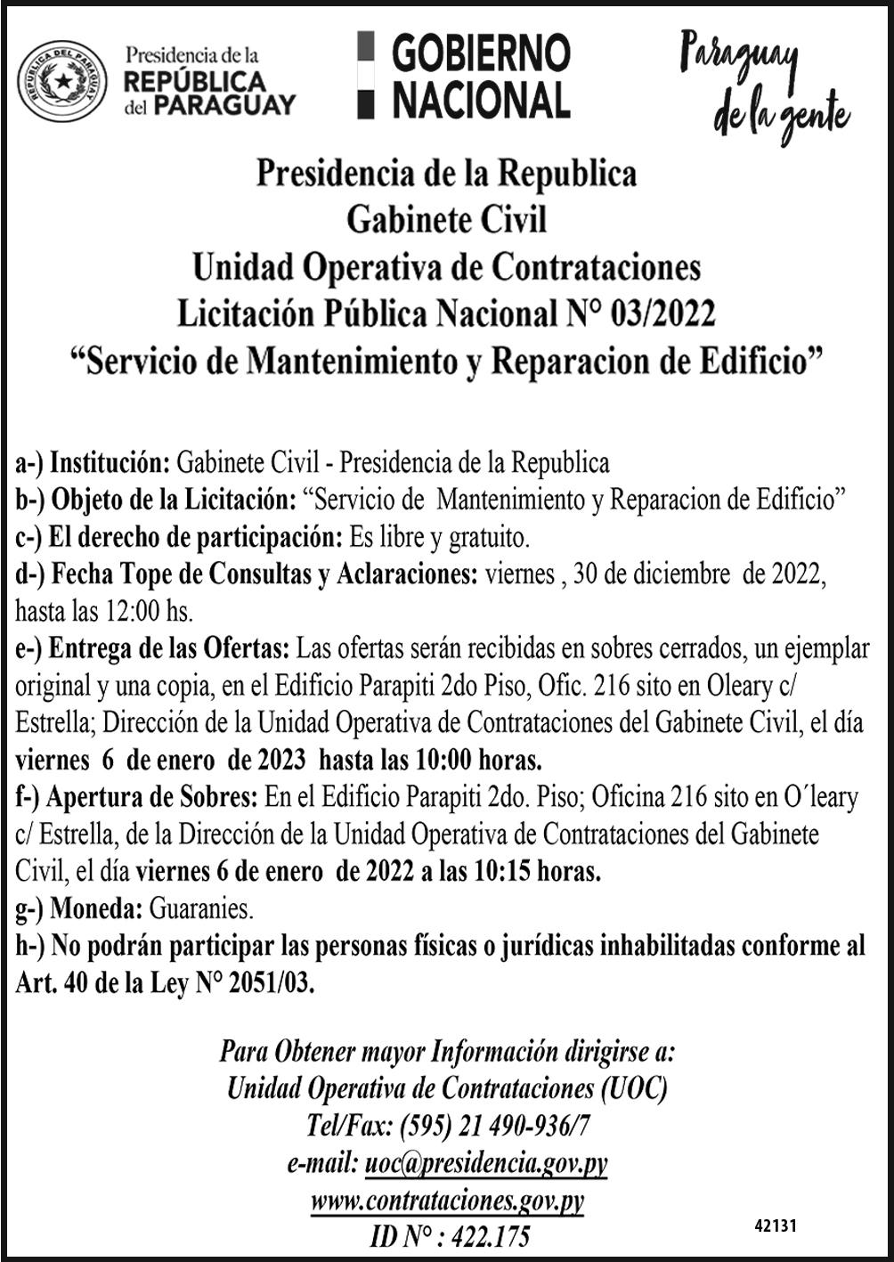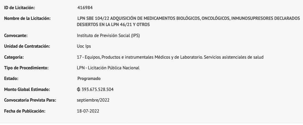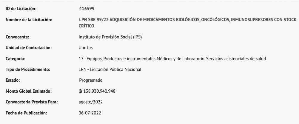 Uno de los llamados de licitación para adquisición de medicamentos biológicos, oncológicos, inmunosupresores se había publicado el 18 de julio del 2022 en el portal de la Dirección Nacional de Contrataciones Públicas (DNCP), en la sección de planificación. En este proceso, de contrato abierto, se prevé adquirir hasta 5.123.424 unidades de fármacos, distribuidos en 29 ítems.