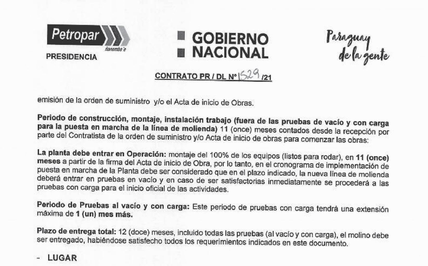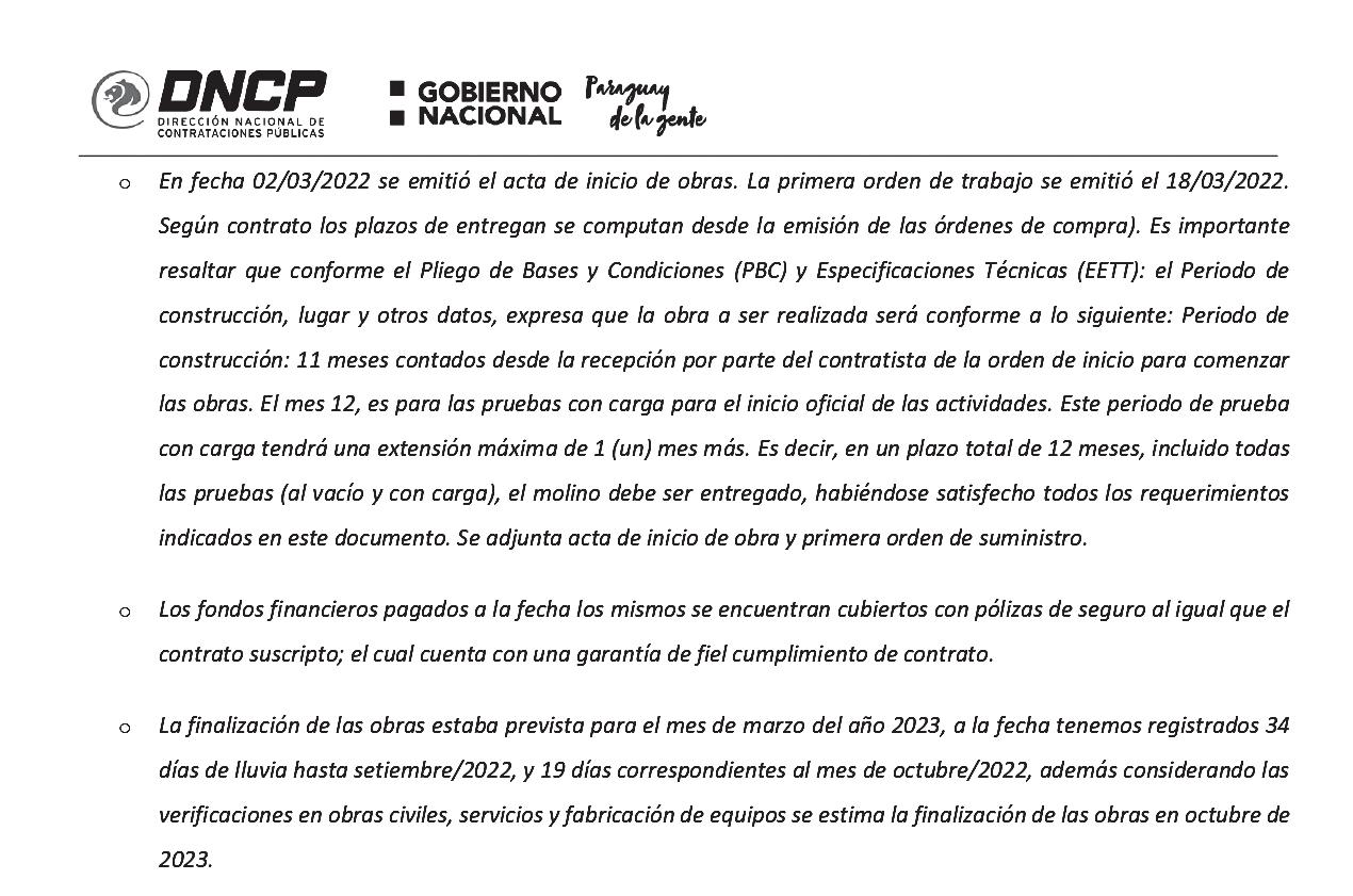 Petropar informó a la DNCP que los plazos de las obras recién empezaron a correr desde marzo del 2022, y no desde diciembre del 2021 cuando se firmó el contrato. Alega que las lluvias retrasaron las obras, así como otras situaciones, por lo que se estima que todo finalizaría en octubre del 2023