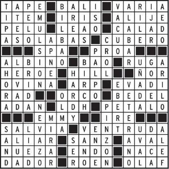 32. Mamífero paquidermo que vive en los bosques de América Meridional. 35. Memoria de computadora. 36. Organización internacional con sede en EEUU, fundada en 1945 para fomentar las relaciones amistosas entre las naciones (sigla) 38. Píldora (inglés). 39. Antipatía y aversión hacia alguien. 40. Género de ofidios venenosos al que pertenece la cobra.