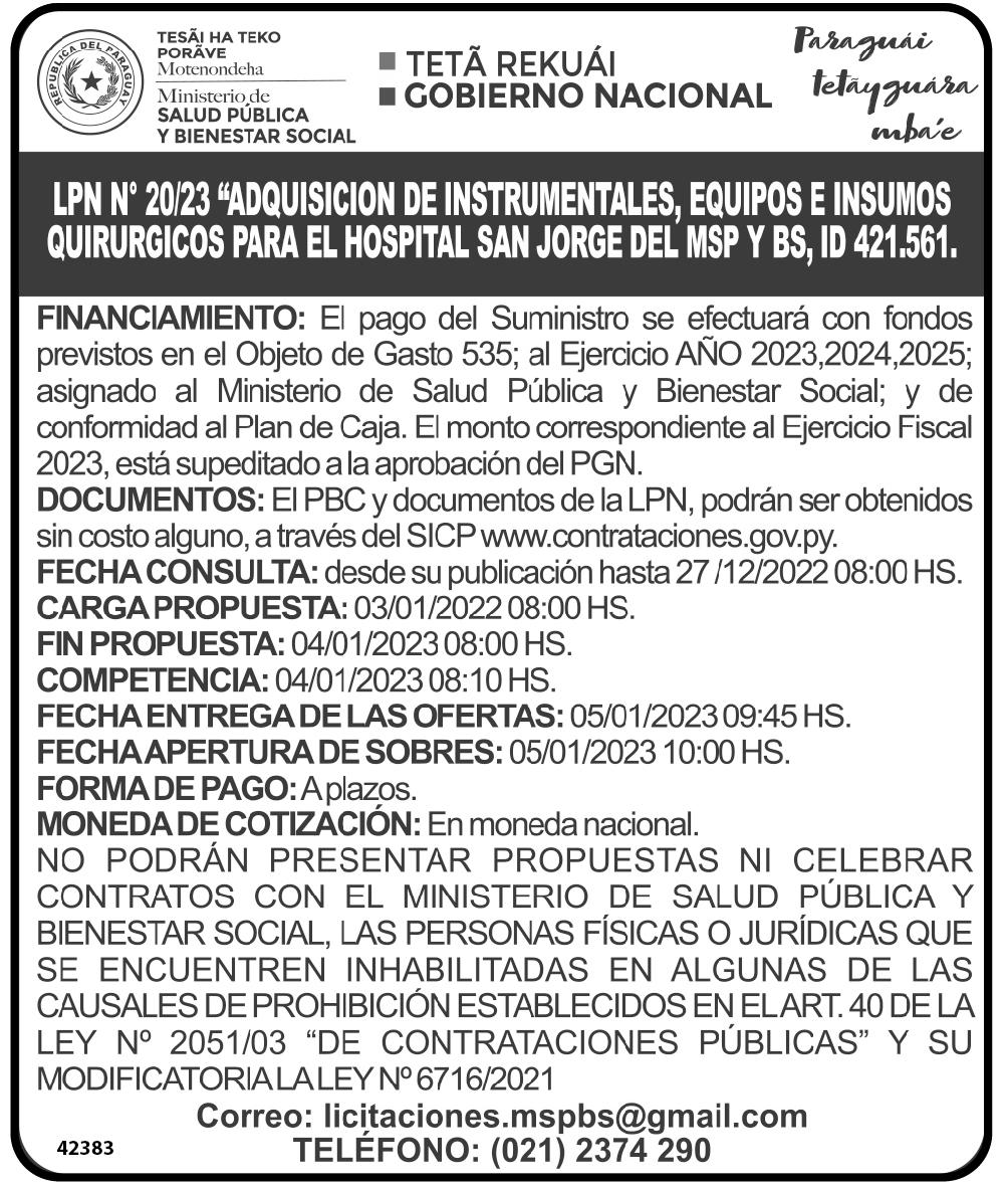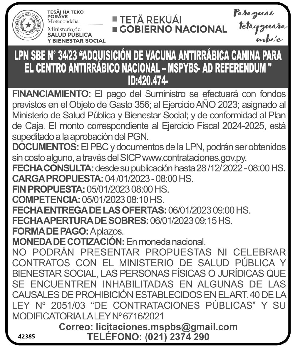 Para este llamado el IPS prevé desembolsar hasta G. 123.094 millones, lo que al cambio actual representa US$ 16.8 millones, monto con la que se pretende adquirir un total de 77 tipos de fármacos esenciales enlistados en el apartado de ítems solicitados.