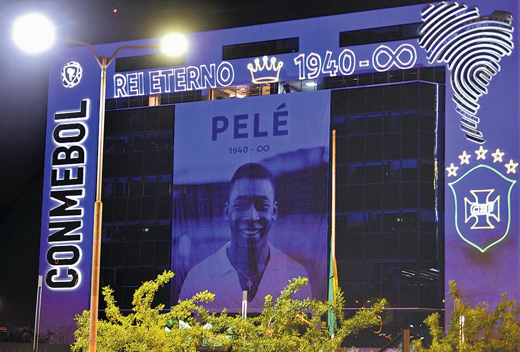 Una imagen de la leyenda del fútbol Edson Arantes do Nascimento, conocido como Pelé, luce en la fachada de la sede de la Conmebol, en Luque, Paraguay.