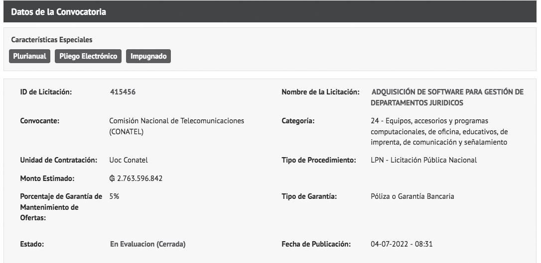 El primer llamado que realizó la Conatel para la adquisición del software para departamentos jurídicos fue el 4 de julio del 2022, y el monto estimado a invertir era de G. 2 763 millones.