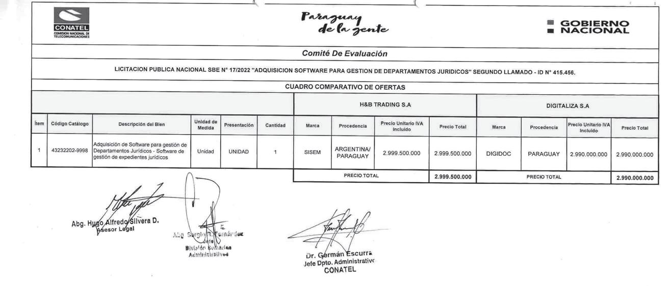 Según los documentos obrantes en el portal de Contrataciones Públicas, la Conatel adjudicó la oferta más cara del segundo proceso en el que solamente se presentaron dos firmas, la adjudicada H&B Trading SA cerró el contrato por G. 2.999.500.00, y Digitaliza SA, cuya oferta fue de G. 2.990.000.000, aproximadamente G. 9.500.000 menos, fue desestimada.