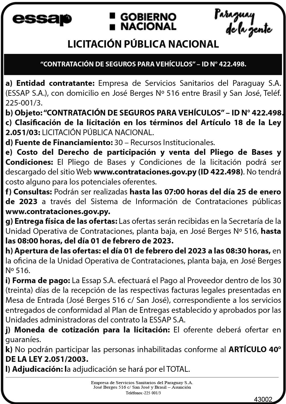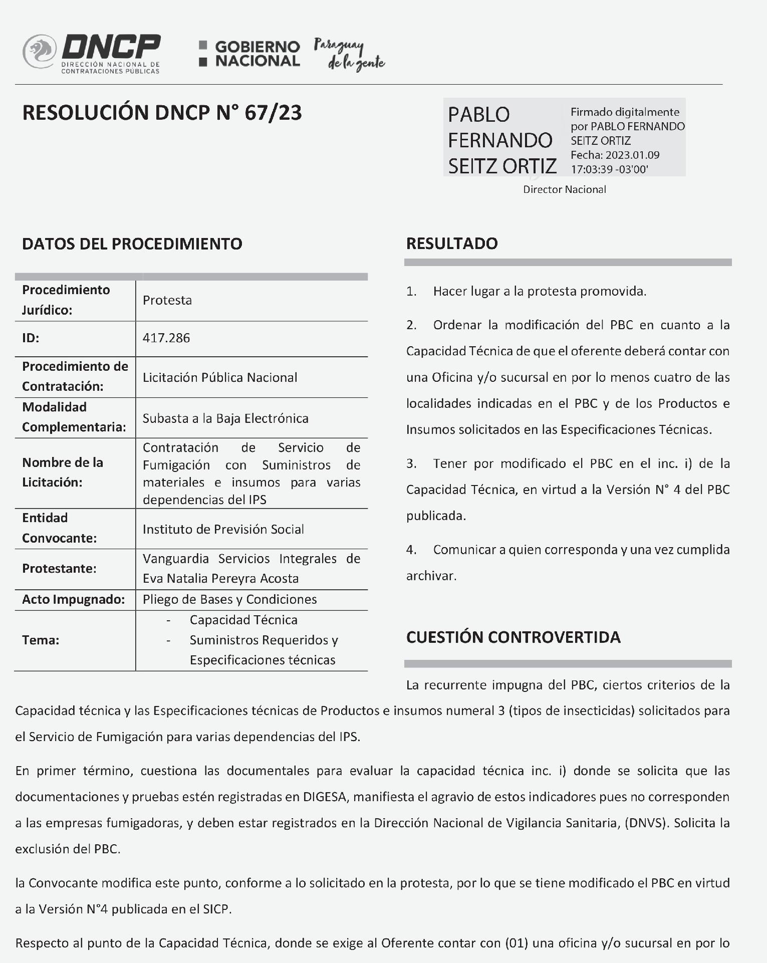 La Dirección Nacional de Contrataciones Públicas dio lugar a protestas en el proceso licitatorio para la fumigación de las distintas sedes del Instituto de Previsión Social (IPS) donde se señala un supuesto direccionamiento del llamado. Los reclamos sostienen que el pliego de bases y condiciones cuenta con puntos que son “desmotivadores y limitantes” y se centran tanto en la exigencia de documentos que obran en manos de empresas privadas, como el requerimiento de que los oferentes deben tener al menos cuatro sedes en ciudades específicas y la propia fórmula del producto a ser utilizado.