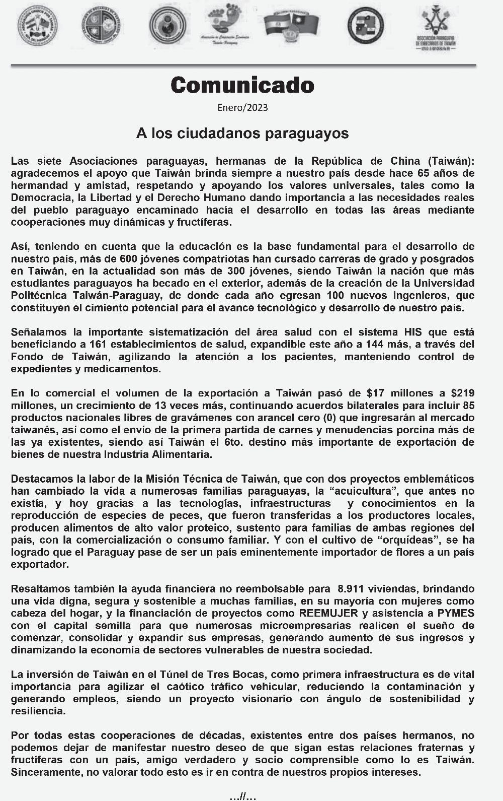 El documento explica detalladamente los varios proyectos sociales que unen a Paraguay con Taiwán y el perjuicio que puede generar, principalmente para nuestro país, un quiebre en la relación bilateral y está firmado por la Asociación de Taiwán ICDF de Paraguay, Asociación de egresados de Fu Hsing Kang, Asociación unidos por Taiwán, Asociación paraguaya de ex becarios de Taiwán, Asociación de ex becarios de Iclpst; Asociación de ex becarios de posgrado de la universidad Tamkang; Asociación de