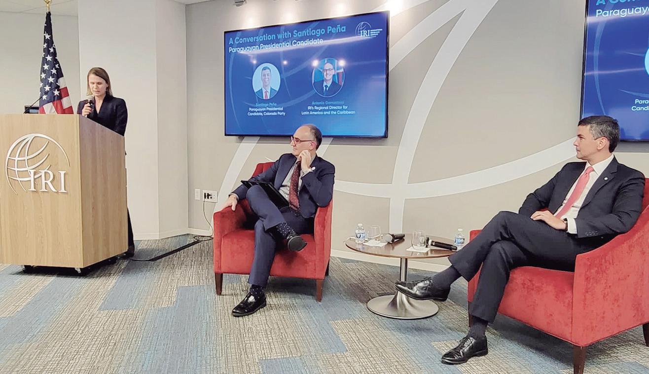 Antes de ser recibido por Bruce Friedman, director para el Cono Sur del Departamento de Estado, Santiago Peña se reunió con Antonio Garrastazu, director regional para América Latina del Instituto Republicano Internacional (IRI, por sus siglas en inglés), una organización que promueve la democracia y la libertad. Posteriormente, tomó parte de un conversatorio con invitados especiales del instituto norteamericano.